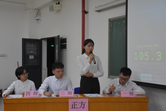 本次辩论赛由公司18级每个班派出的一支队伍进行参赛,共有八支队伍,由抽签决定出场次序、辩题和正反方,并平均分配成两组,同时在三教409、507进行辩论赛。每场辩论赛有开篇立论、攻辩阶段、攻辩小结、自由辩论、总结陈词五个环节,评委们严格遵守评分标准来评判每支队伍的团体分和辩手们的个人分,在主持人带领下,辩论赛的有序地进行。