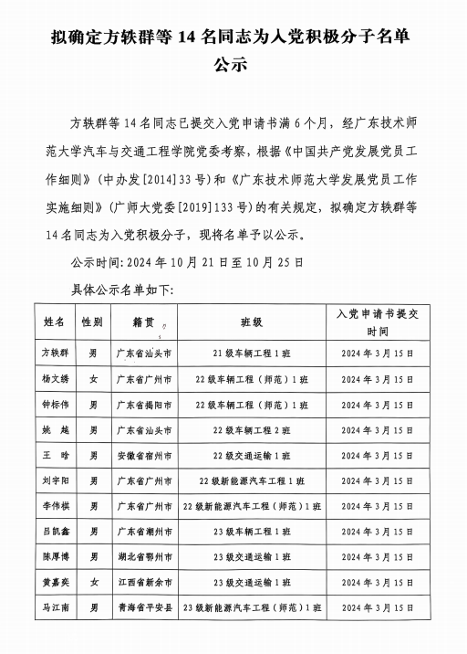 拟确定方轶群等14名同志为入党积极分子名单公示