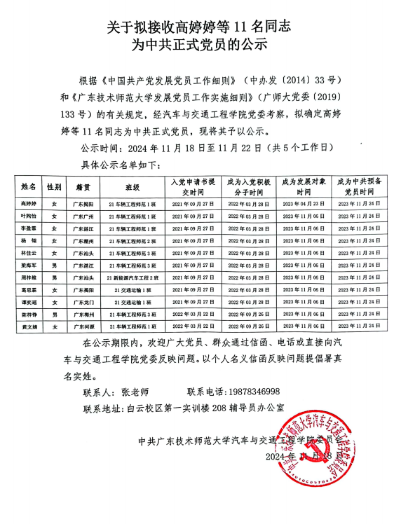 公司党委2024年下半年拟确定高婷婷等11名同志为中共正式党员的公示