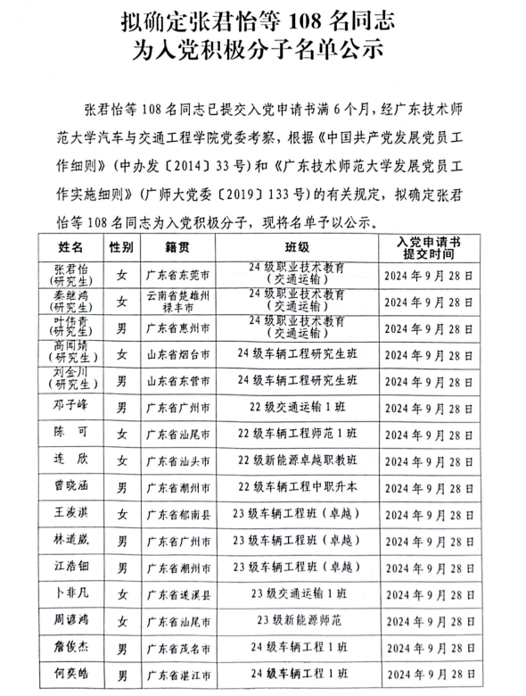 拟确定张君怡等108名同志为入党积极分子名单公示
