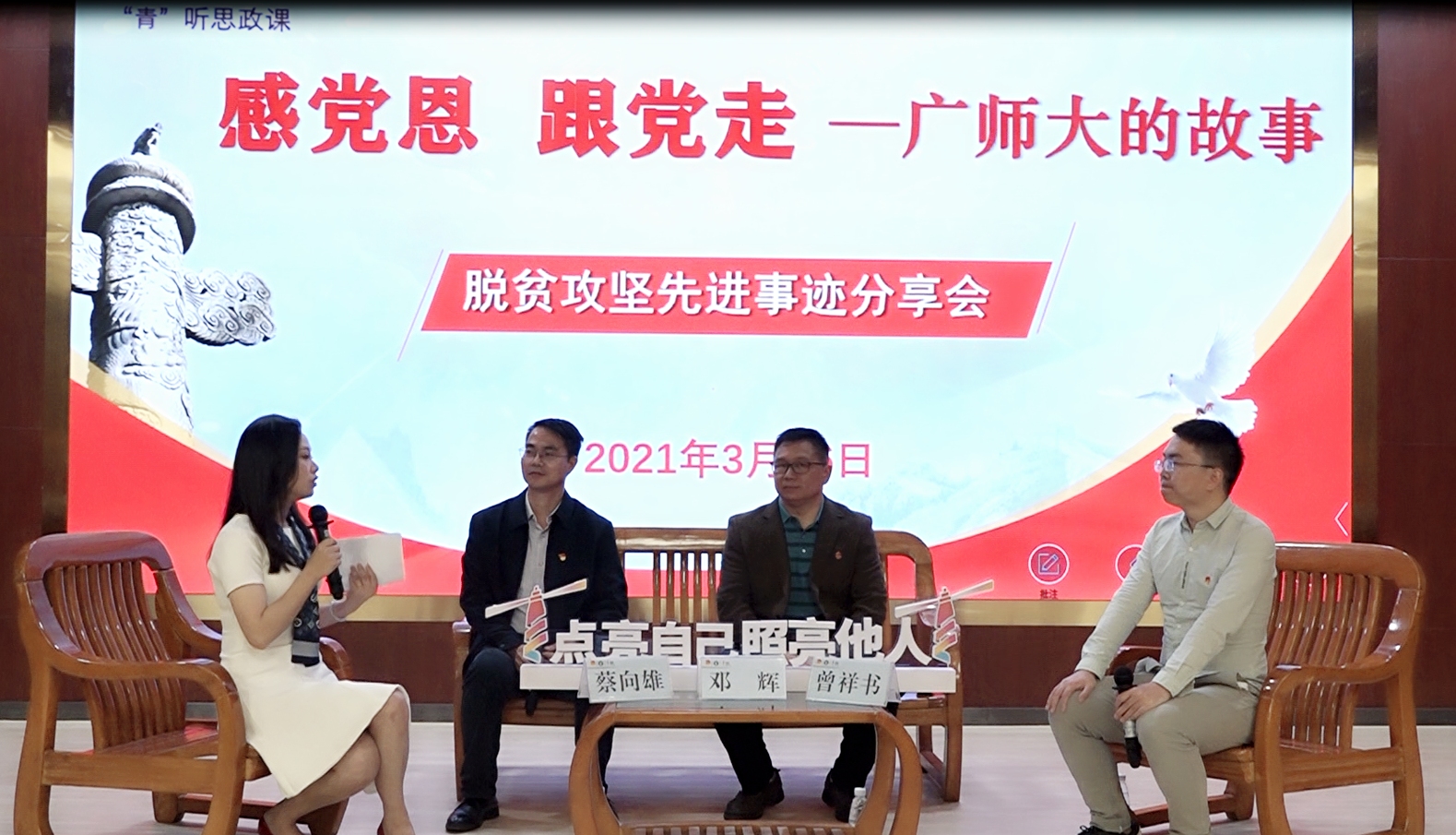 3月26日下午,“感党恩•跟党走——广师大的故事”脱贫攻坚先进事迹分享会暨2021年“青马工程”员工骨干思想引领学习会在东校区第一教学楼208举行,校团委全体干部、各公司团委书记、校级“青马工程”学员、员工干部代表等共200余人参会。
