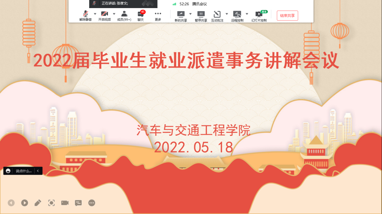 为帮助2022届毕业生更好地了解就业派遣方案编制等相关内容,提供高质量的就业指导服务,公司于5月18日上午,通过腾讯会议召开2022届毕业生就业派遣事务讲解会议。辅导员张孝文老师及2022届全体毕业生参加此次会议。