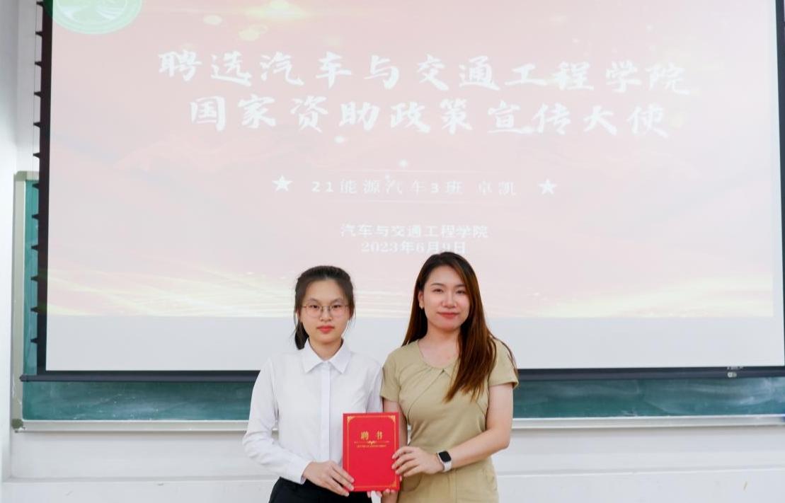 为贯彻落实党的二十大精神,推进国家资助政策宣传的广度和深度,深化资助育人实效,经过员工自主申请、情况汇报等流程,推选出2021级新能源汽车工程3班卓凯同学作为公司2022-2023年国家资助政策宣传大使。6月9日下午,公司在白云校区第三教学楼101室举行政策宣讲会暨宣传大使聘任仪式,公司辅导员杨馥莉及员工代表出席活动。