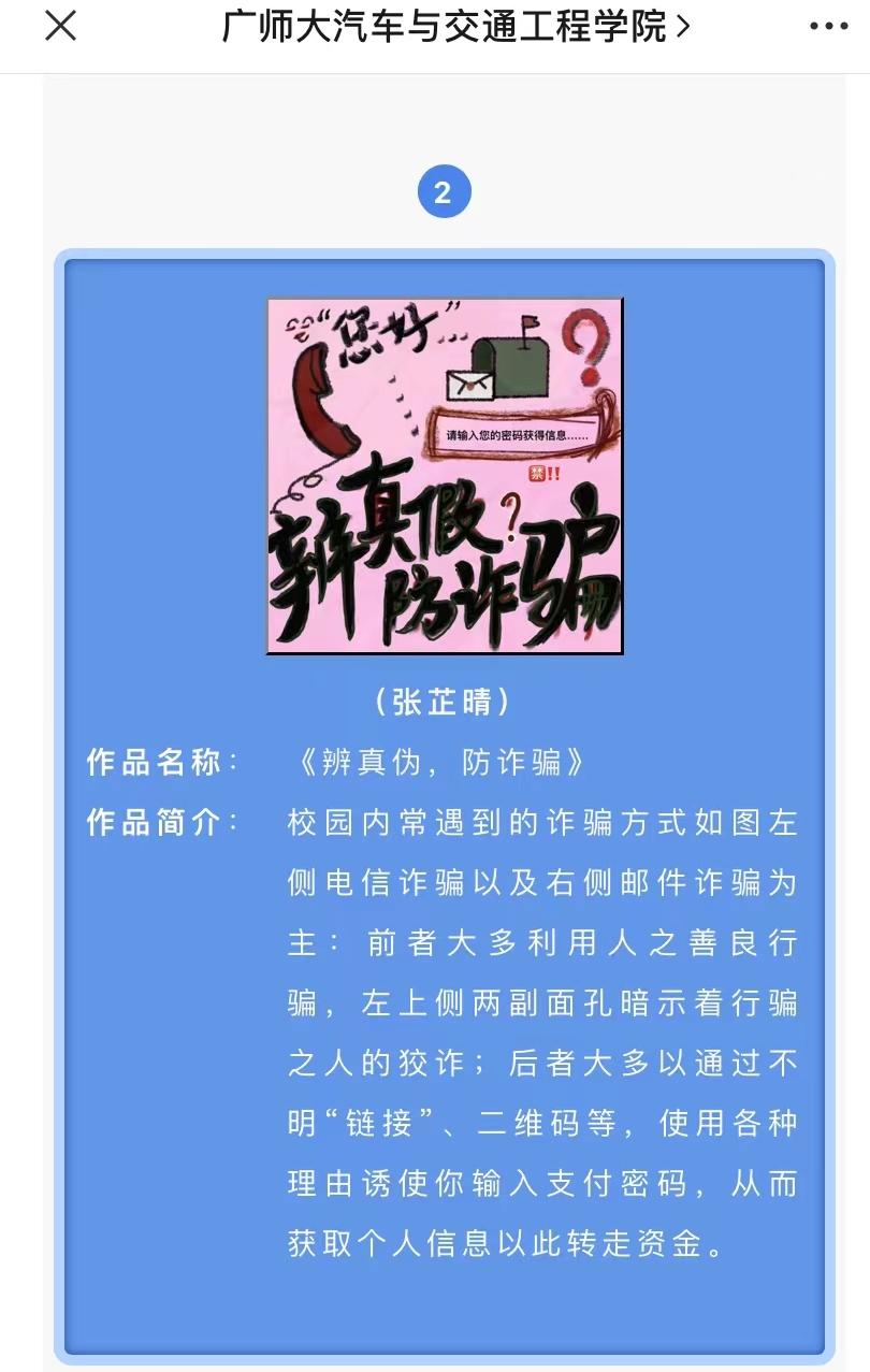 员工踊跃报名参赛,提交平面设计的方式展现金融诈骗、电信诈骗和不良校园贷等诈骗手段。公司通过公司公众号展示优秀作品,普及金融、反诈知识,让同学们能更直观地了解到诈骗手段的多样性,引导大家自觉增强个人财产的保护意识,坚决做到“不轻信,不透露,不转账”,不给诈骗分子可乘之机。