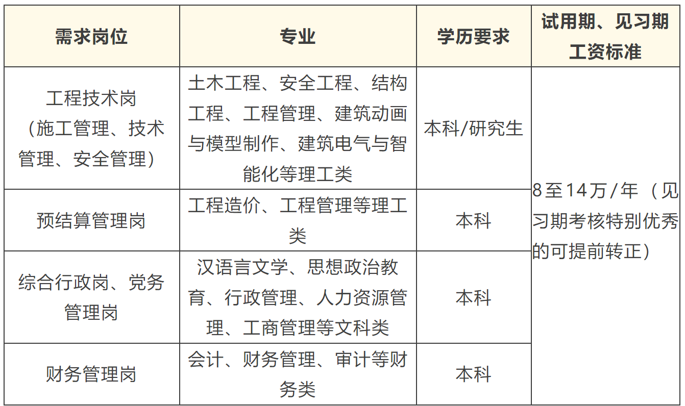 招聘企业管培生以及技术管理岗、施工管理岗、安全管理岗、财务管理岗、行政管理岗、党群工作岗、纪检审计岗若干人。