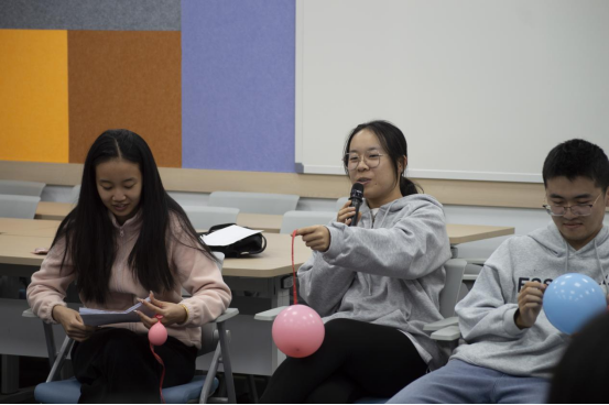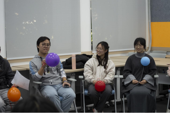 活动伊始,在专业心理教师的引导下,同学们以“捏捏肩膀”作为热身,在围成圆圈的场域互动中逐渐融入活动,欢声笑语不断;在冥想环节,指引同学们深入思考自身所承受的压力,将压力形象化为“气球”,并为它们命名、讨论压力的来源及存在时长;同时,通过抽取“扑克牌”以团队比拼的方式引导研究生正视内心的压力,学会有效的情绪管理和压力应对技巧。