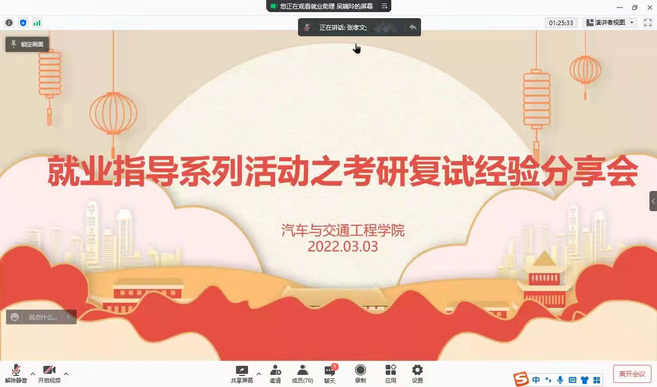 3月3日,公司通过线上举办22届毕业生考研复试调剂经验分享会,分享会邀请到了何宝兰、严予甫、罗嘉铃、陈婉琼、周姿锐等5位优秀员工为大家分享考研复试和调剂的经验,部分19、20级有意向考研的同学参加了本次会议。