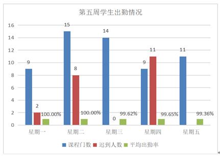 公司一直重视线上教学课堂纪律管理,要求所有课程在线上教学期间均严格进行考勤工作,员工总体出勤率高。第五周,每天的课程门次和员工出勤情况如图9所示,每天各门课的平均出勤率在99.3%以上,总的平均出勤率为99.73%,比第四周略有提高。仍有个别员工存在迟到情况,周二、周四两天共迟到19人次。整周来看,每天平均迟到人次为4.2,比第四周下降了0.6,迟到现象持续有所改善。考虑到网络状态、签到时间节点控制等情况,员工总体出勤情况良好。