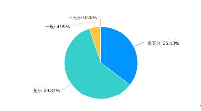 从同学们反馈情况来看,大部分老师线上教学的课前准备充分,其中认为很充分的占35.43%、认为充分的占59.32%,认为准备情况一般的只有约5%,认为不充分的只有0.26%,可见,老师们的课前准备工作还是做得比较认真。