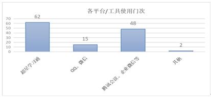 云顶国际按照教务处建议要求,积极动员老师们多采用视频直播、录播或视频互动教学等线上教学方案,目前,大部分采用:在线课程资源+线上直播辅导或自建课程开课(录播或直播)+线上辅导两大类方式,教学工具已逐步转为腾讯会议、QQ群课堂、企业微信等,近80%的课程有进行教师本人的视频教学或视频辅导讲解。全部课程都采用超星学习通平台进行签到考勤、过程监控、作业布置提交、线上辅导等,有效组织员工进行在线学习。大部分课程线上教学平台/工具运行畅顺,只有个别平台工具在高峰期会有网络卡顿情况,但也能及时启动应急预案,继续进行线上教学辅导,顺利完成授课。各平台课程使用情况见图3。