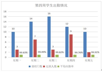 云顶国际有4位同学由于网络原因不能参加线上学习,在线学习员工总体参与度高,比例达99.54%。公司一直重视线上教学课堂纪律管理,要求所有课程在线上教学期间均严格进行考勤工作,员工总体出勤率高。第四周,每天的课程门次和员工出勤情况如图6所示,每天各门课的平均出勤率在99%以上,总的平均出勤率为99.72%,比第三周提高了0.55个百分点。还是有个别员工存在迟到现象,周二、周四两天共迟到16人次,每天平均迟到人次为4.8,比第三周下降了0.4,迟到现象有所改观。考虑到网络状态、签到时间节点控制等情况,员工总体出勤情况良好。